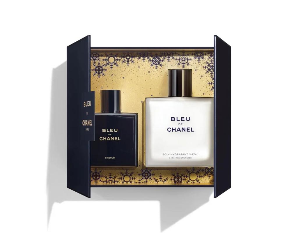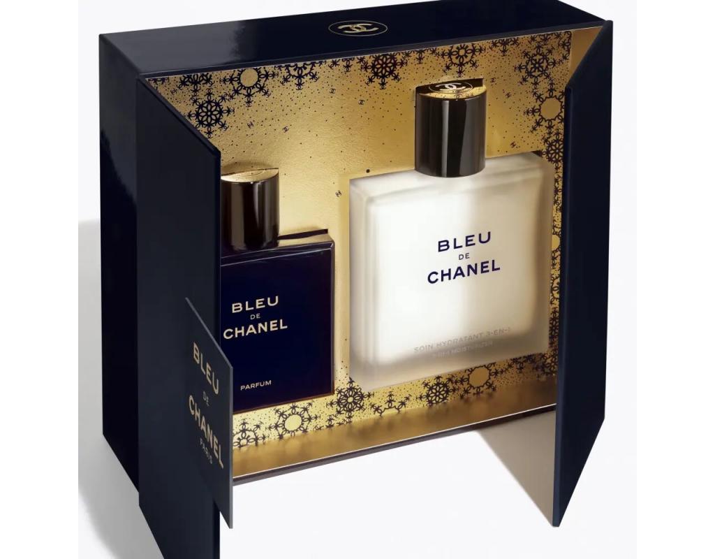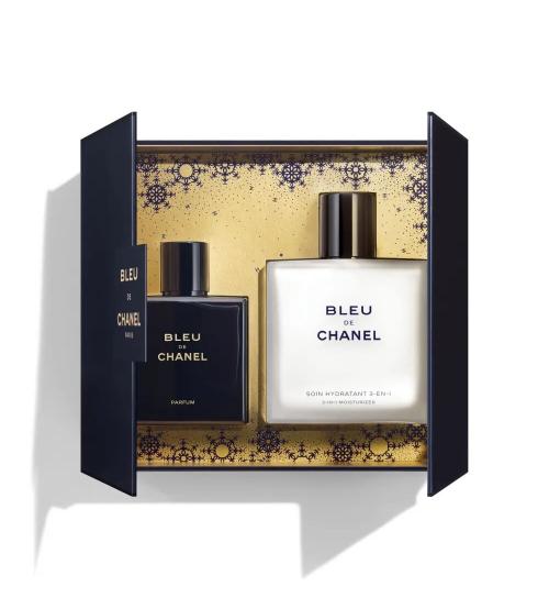 Showcased in a limited-edition case adorned with signature snowflakes, BLEU DE CHANEL Parfum and BLEU DE CHANEL 3-in-1 Moisturizer offer a masculine ritual featuring woody, aromatic notes.