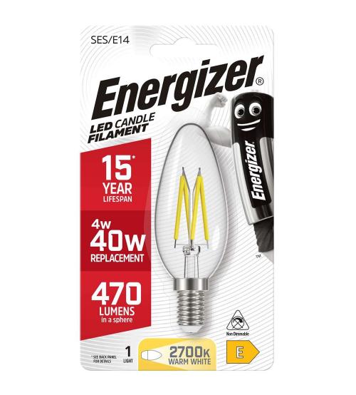 Energizer Filament LED Lighting Candle 470LM/Lumen E14 Light bulb Warm White Blister Pack. The Energizer lighting range is manufactured to the highest standards, compliant with the latest lamp industry regulations. The LED rage includes high performance, economical and sustainable technologies. The collection compromises all of the most popular shapes and offers dimmable and non-dimmable solutions.