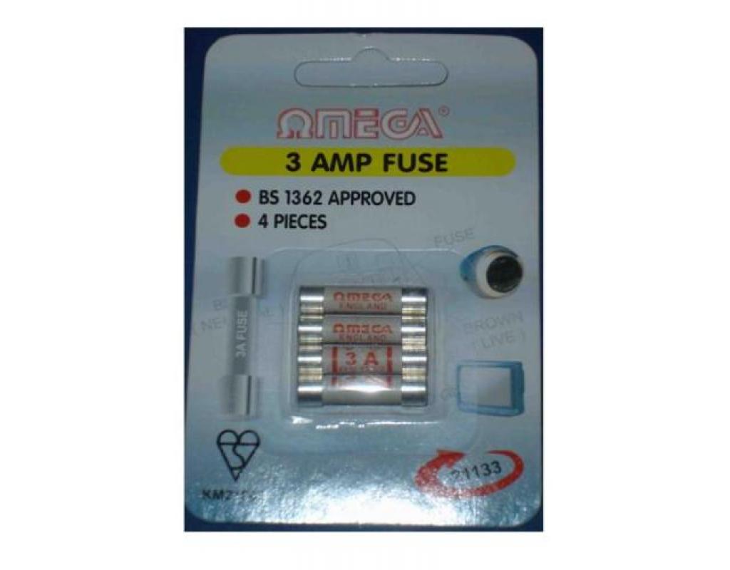 Omega 21133 3 Amp Mains Electrical Safety Plug Fuses UK Pack of 4 Blister Pack