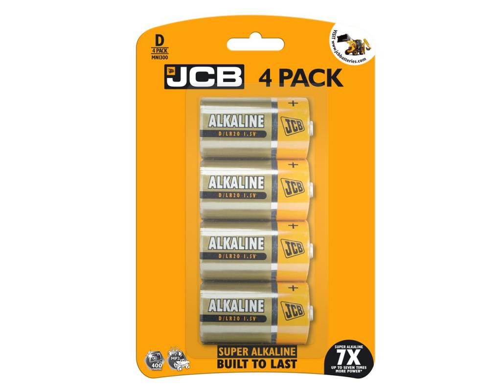 Pack of 4 D Size Super Alkaline batteries from JCB.