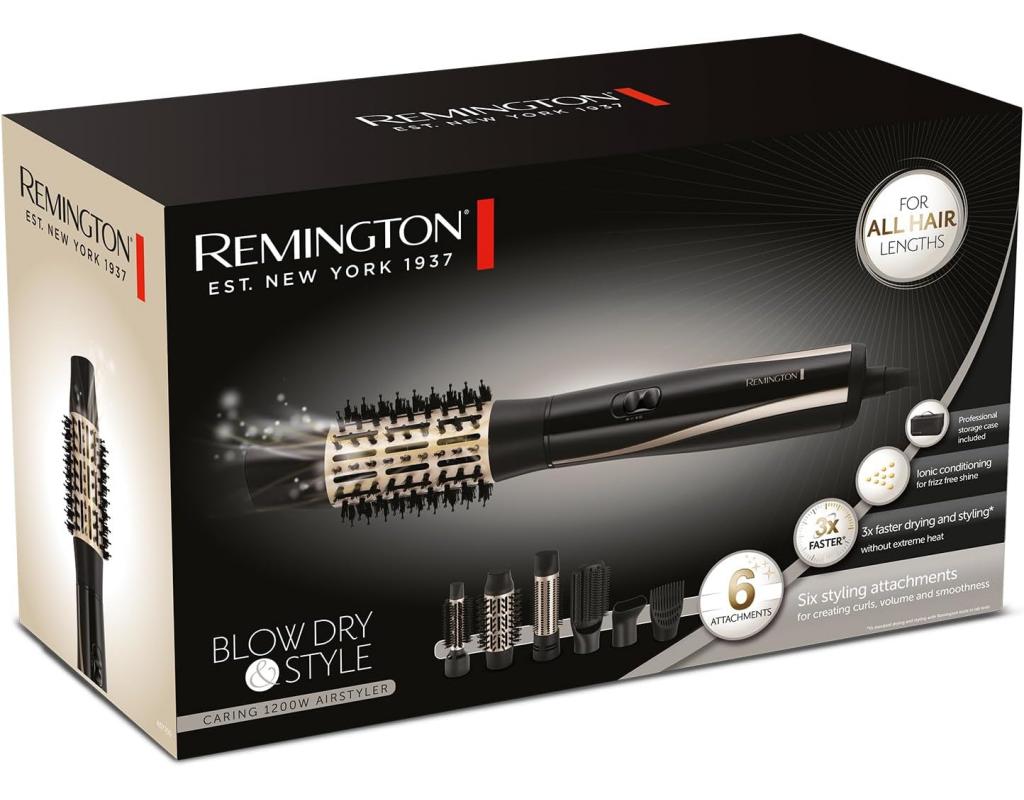 Get ready with 3x faster* results with the Remington Blow Dry and Style Caring 1200W Airstyler. It gently dries and styles in one step and has 6 Interchangeable attachments so you’re in control of your style.