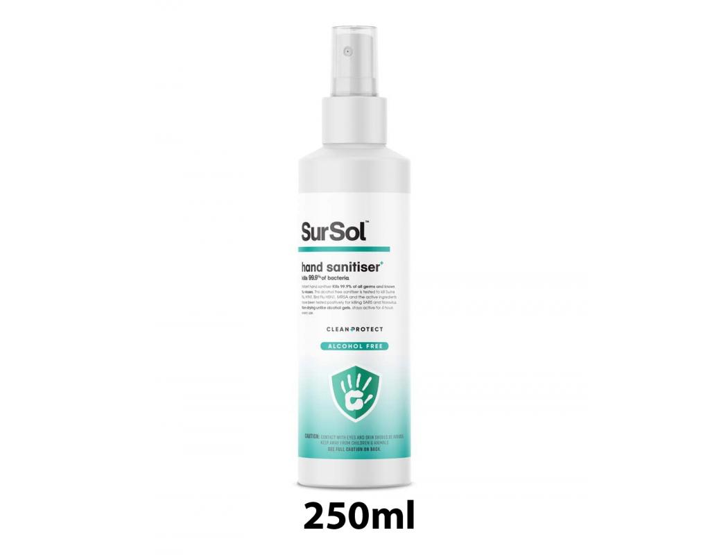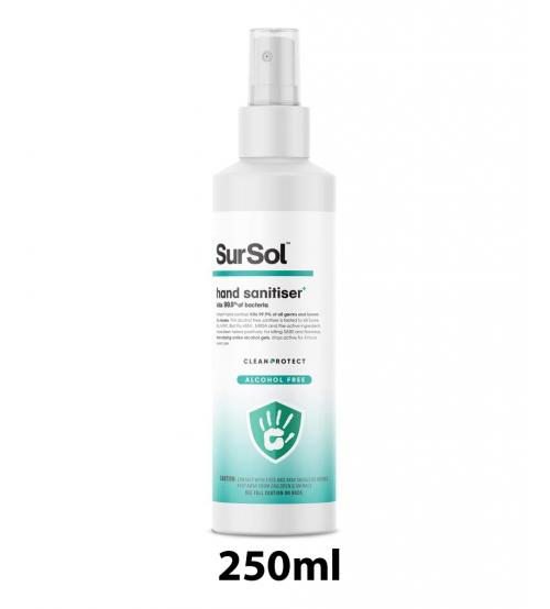 Long-Lasting, Alcohol-Free Hand Sanitiser Spray that Effectively Kills 99.8% of All Germs and Known Flu Viruses Protect yourself and your family from all germs and known flu viruses with the highly effective SurSol Alcohol-Free Hand Sanitiser Spray. In this climate, we must do all we can to protect ourselves from potentially deadly viruses and germs, both at home and when out. This powerful hand sanitiser is scientifically proven to kill 99.8% of germs and all known flu viruses, and during independent laboratory-controlled trials effectively eradicated (in under 15 seconds): Swine flu Winter flu Bird flu MRSA SARS Norovirus Suitable for use on the whole family and anyone with sensitive skin, this powerful, water-based spray is alcohol-free yet kills germs and bacteria within seconds. Any bacteria that comes into contact with the skin within four hours of use will also be eradicated. Formulated with active ingredients that comply with the EN 1276 and EN 14476 testing standards, SurSol Alcohol-Free Hand Sanitiser Spray is a powerful formulation designed to eliminate 99.8% of bacteria and viruses. It is vegan-friendly and certified cruelty-free so not only can you help to prevent the spread of illness and protect yourself and your family; you can do so with a clear conscience.