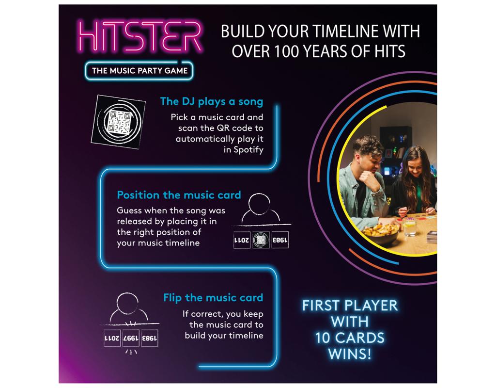 Start the fun in no time. Just choose a music card, scan the QR code with the free Hitster app, and let the music take the party to the next level. Whether you're up for competitive showdowns, cooperative teamwork, or solo challenges, Hitster delivers a variety of game modes for all music lovers.