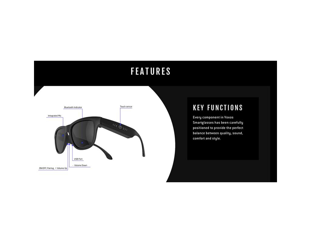 Voxos is a pair of Smartglasses that uses bone conduction technology to transfer sound to the user's brain by vibrating the bones in the skull. This sends sound waves through the bones leaving the natural hearing sense through the ears free. .This enables the consumption of audio content on the go, while still perceiving all environment around him/her.